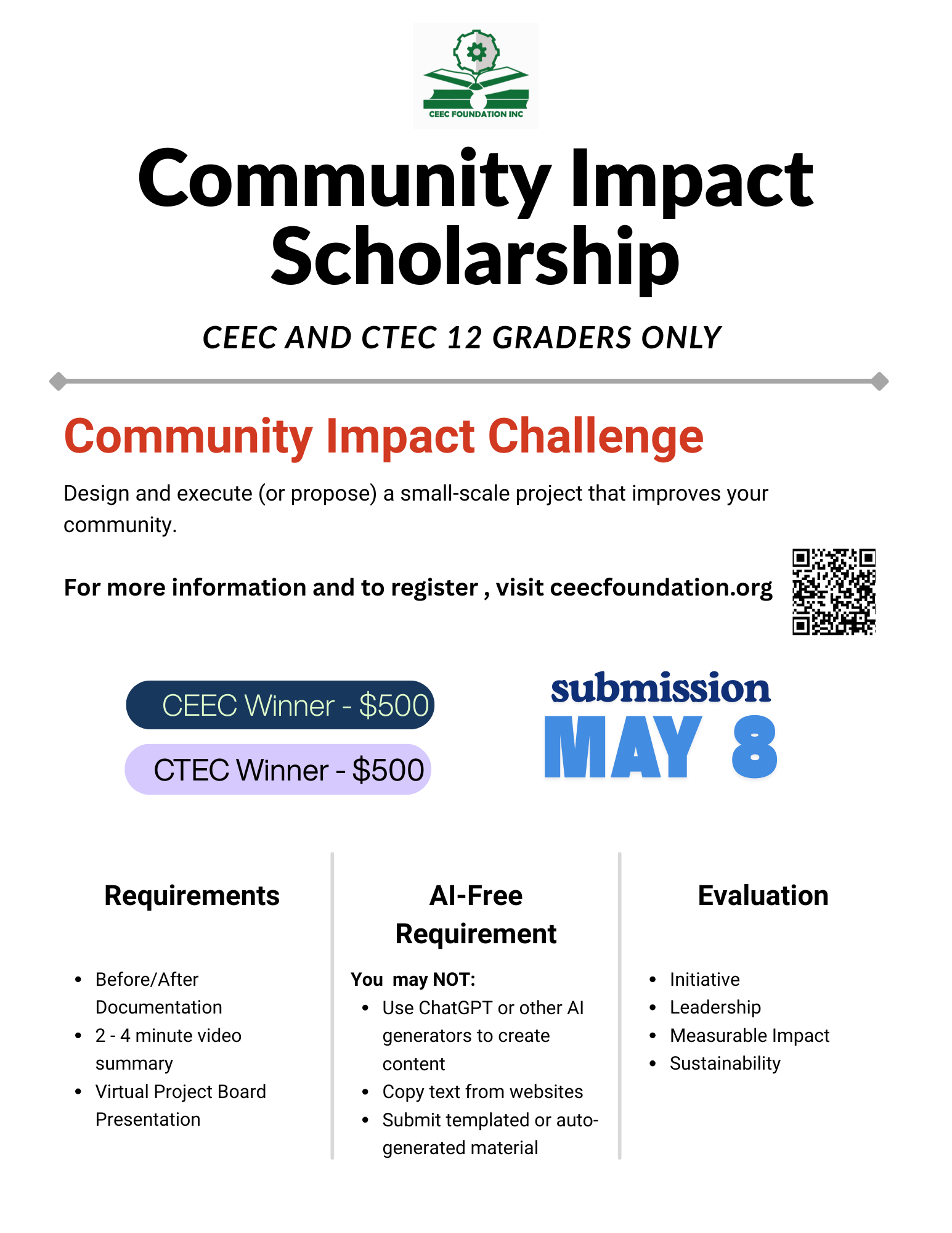 The Community Impact Challenge is ONLY for students in grade 12, who attend the CEEC and CTEC.